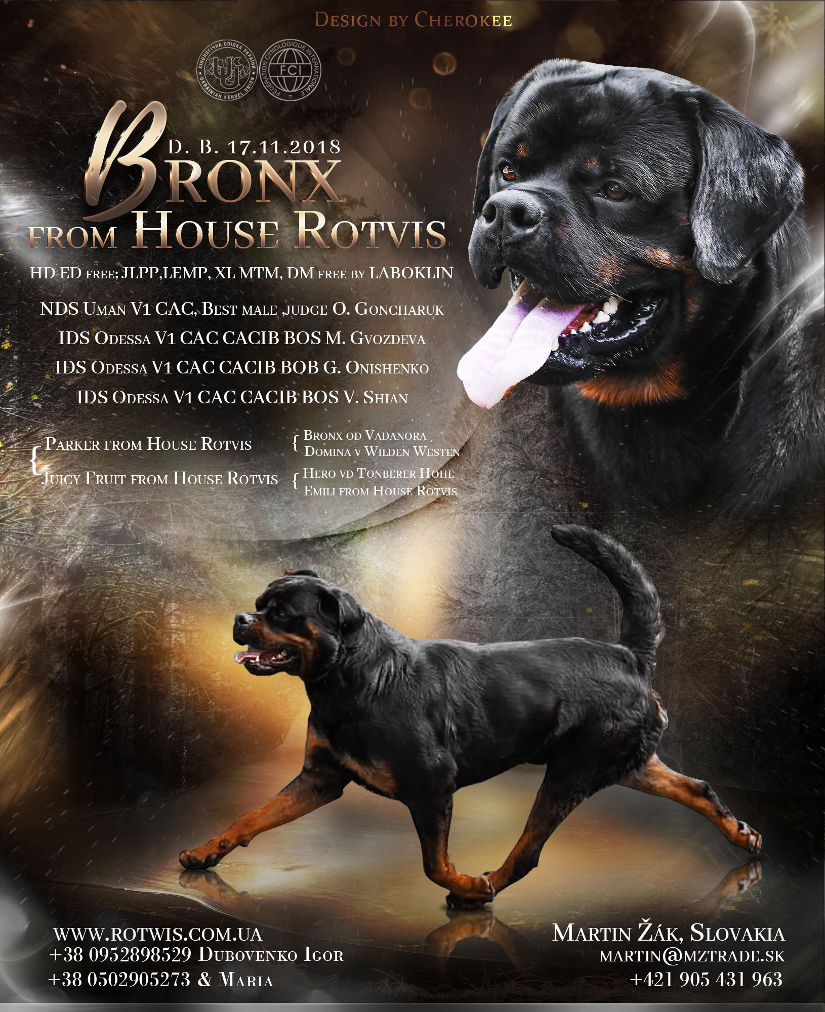 Bronx mother is gorgeous female of our breeding Juicy Fruit from House Rotvis , daughter of ADRK legendary stud Hero vd Tonberger Hohe and Emili from House Rotvis - daughter of Morro vd Scherau and Tinka vd Scherau - gold reserve of our kennel!