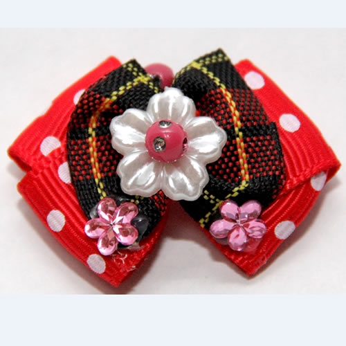 | Бантик на резинке красная полька с жемчугом 1.6 см