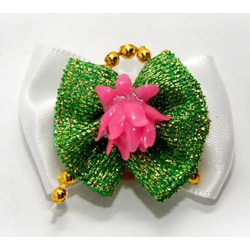 | Бантик на резинке бело-зеленый с розовым лотосом 3,5 см